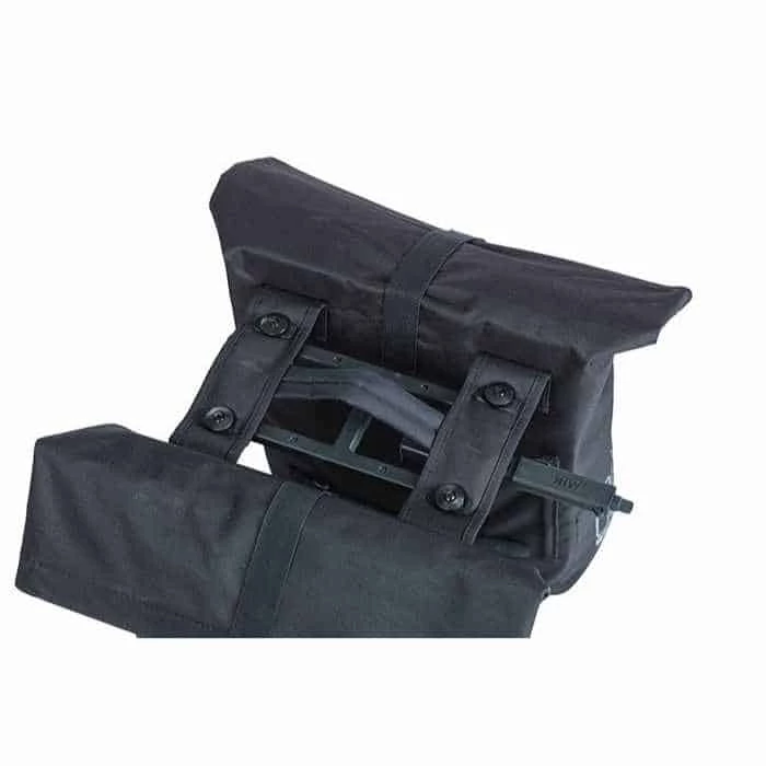 Die schwarze Fahrrad-Doppeltasche wird aus Polyester