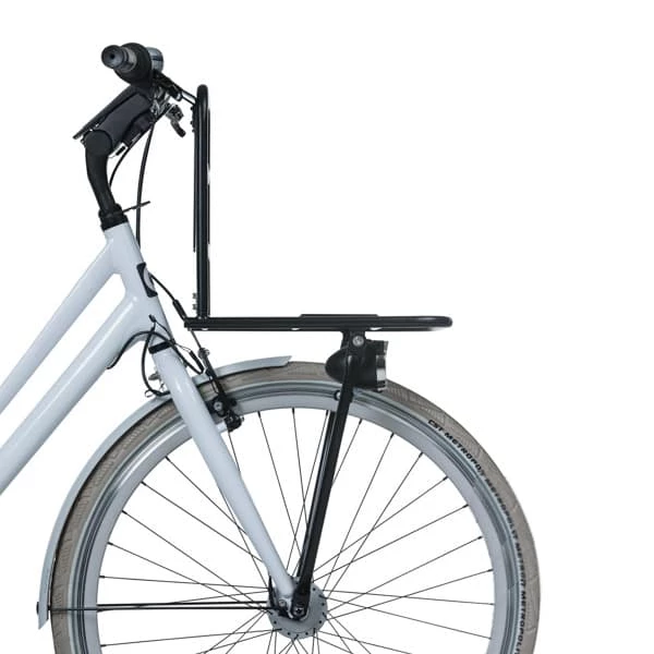 Der schwarze Basil Front Carrier L wird an der