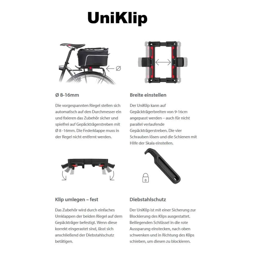 Der UniKlip ist geeignet für alle Gepäckträger mit einer Breite von 9 bis 16